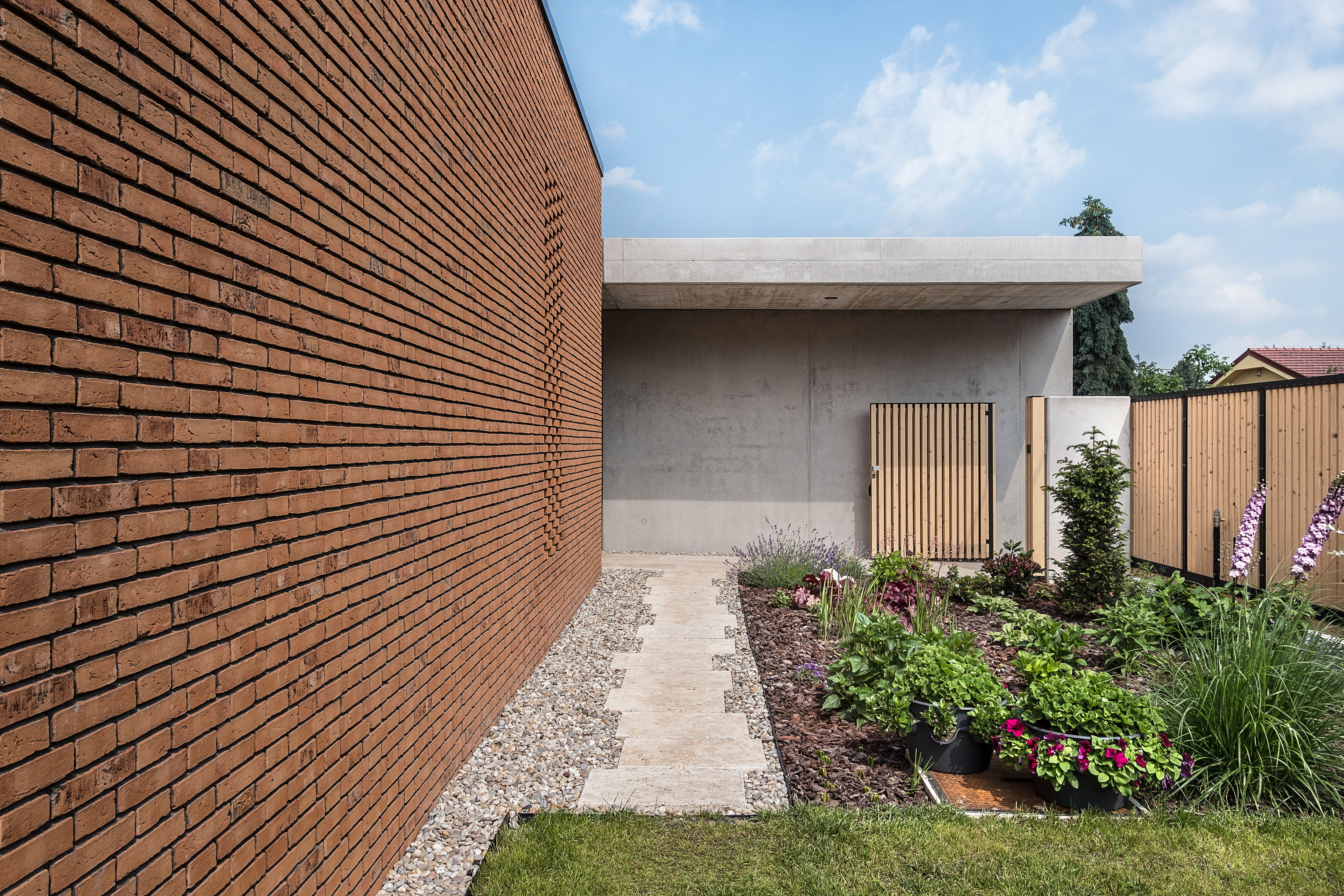 "V kedysi záhradkárskej štvrti vo východnej časti Bratislavy sme navrhli rodinný dom pre starší manželský pár. Stredobodom pôdorysu je kuchyňa, z ktorej má pani domáca prehľad o celom dome. Členitá hmota vymedzuje dve exteriérové terasy, každú s inými svetelnými a pobytovými kvalitami, všetky len na skok z centrálnej kuchyne. Exponovaná, južná slnečná terasa s bazénom je krytá betónovou konzolou a drevenými lamelami ktoré zamedzujú nežiadúce priehľady od susedov. Severná “kamenná” terasa s pôvodnou čerešňou zas predstavuje ideálny únik pred bratislavskými letnými horúčavami. Charakter jednotlivých priestorov a ich rôzne atmosféry dopĺňa trvácne a nadčasové materiálové riešenie domu - režná tehla, drevo, betón, travertín a sklo."