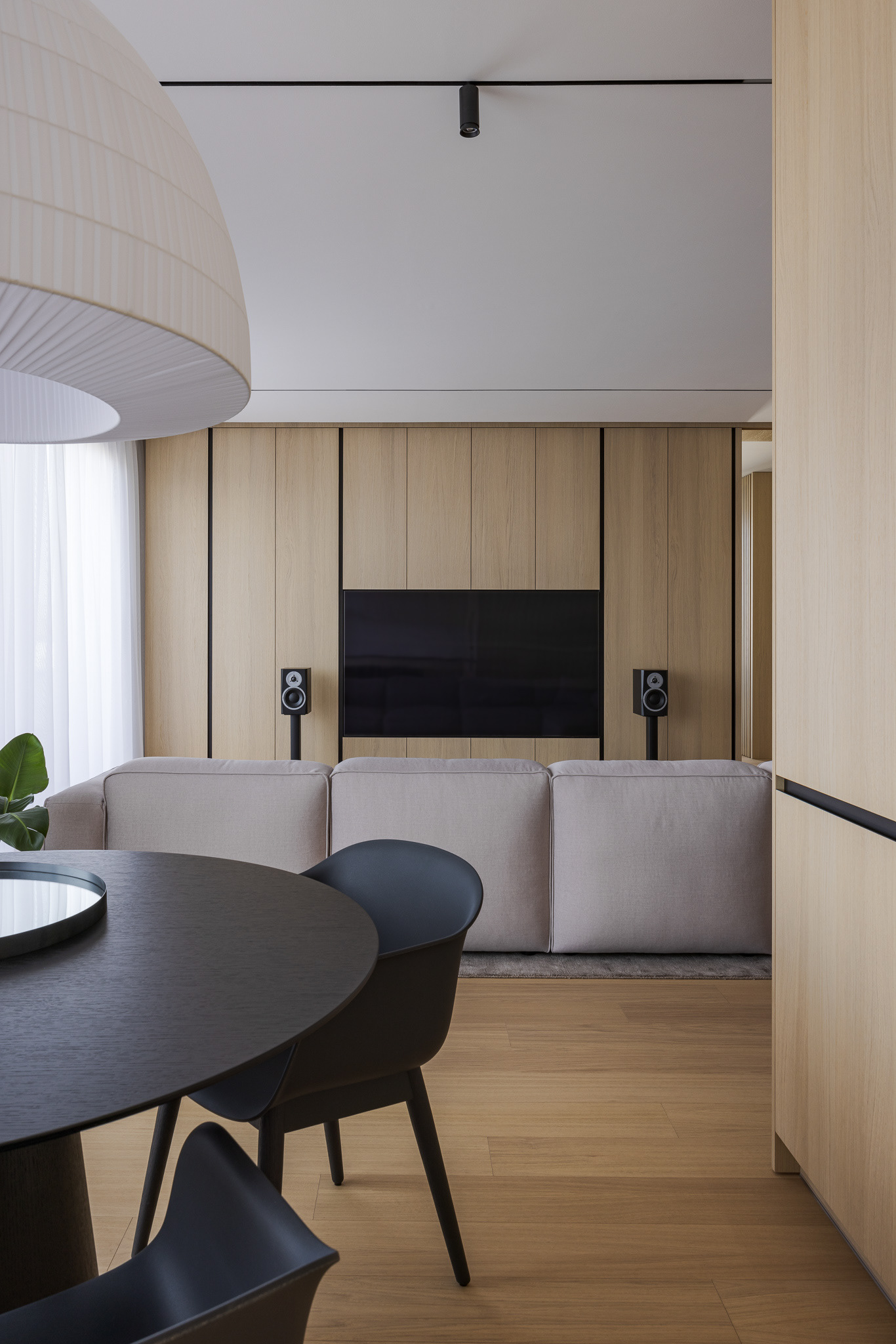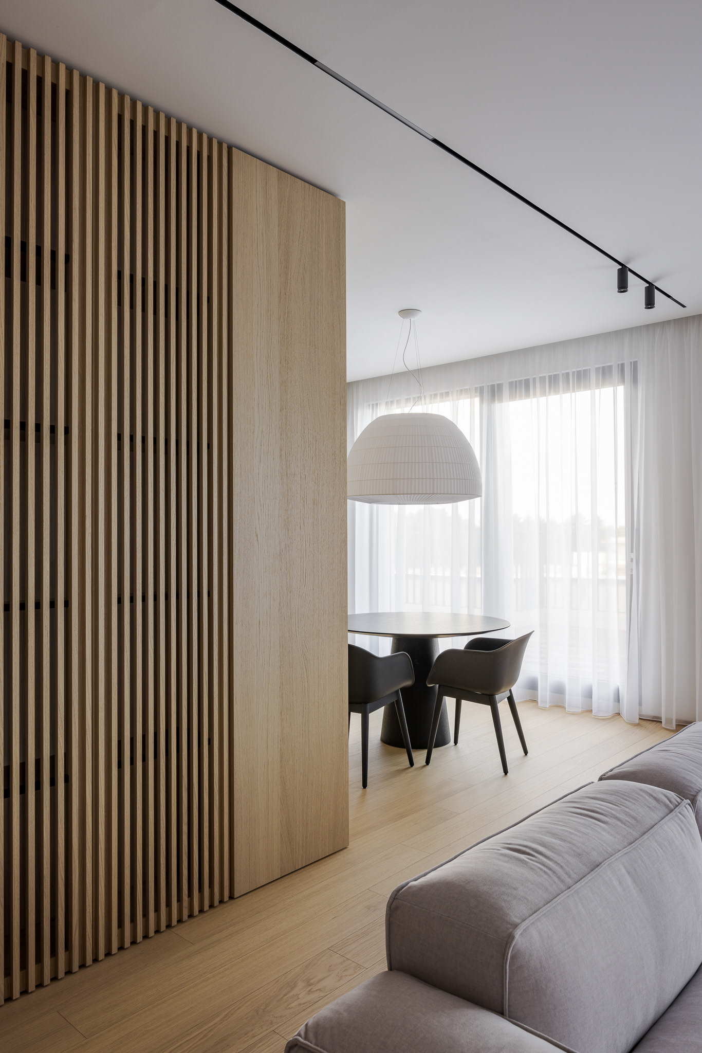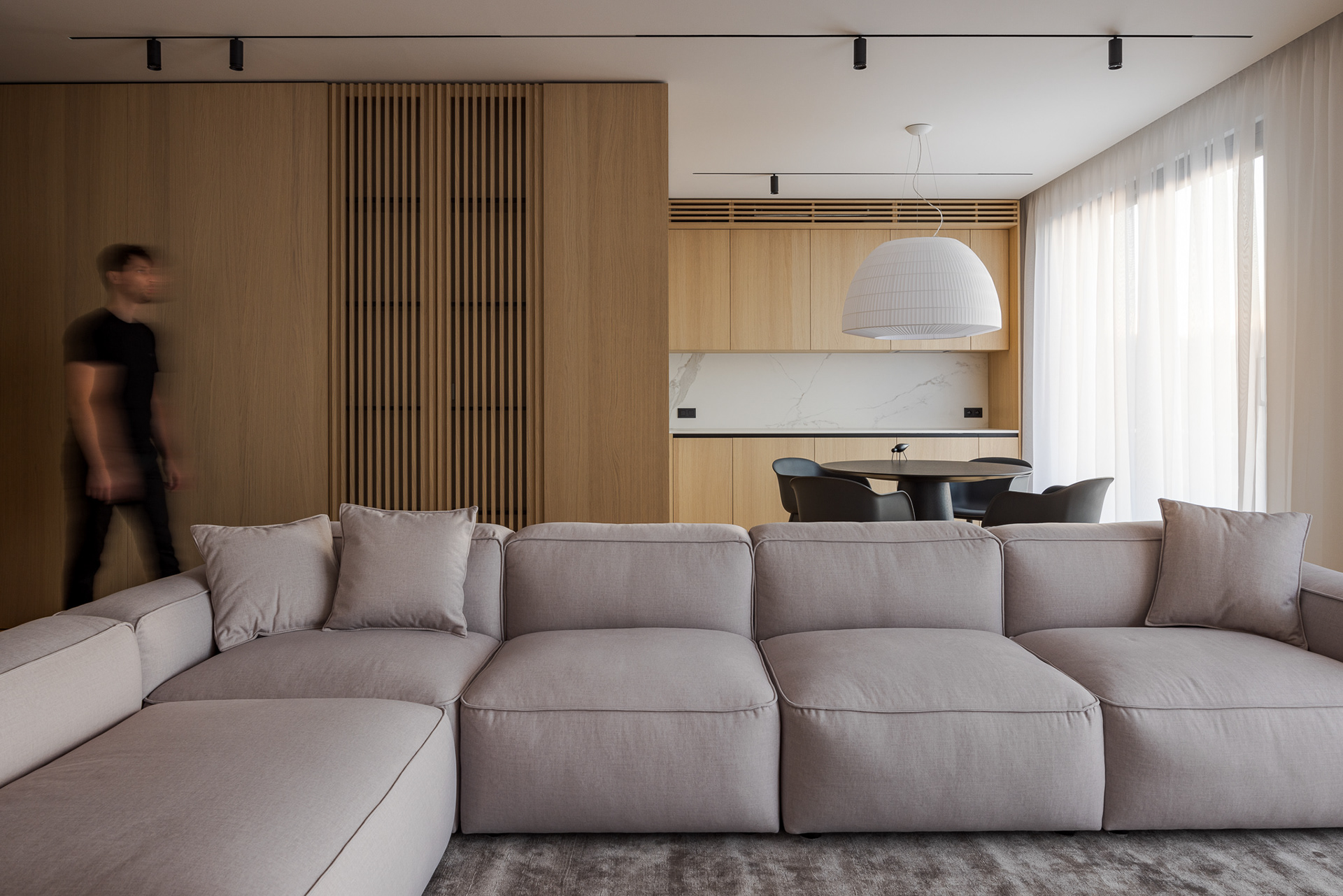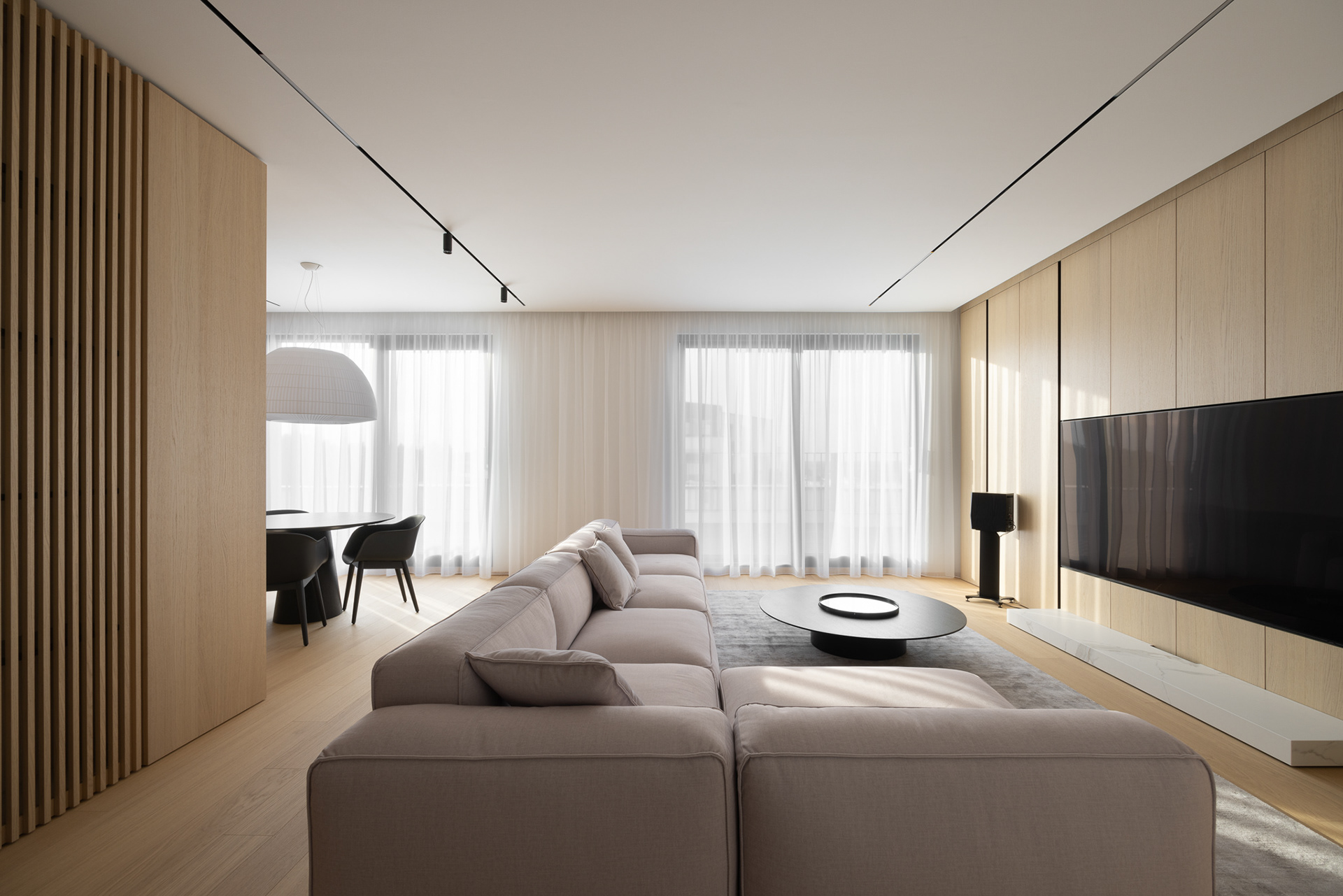 Byt ako celok je navrhnutý v čistých líniach a plochách a v jednotnej materialite s dostatkom úložných priestorov. Vďaka tomu pôsobí uceleným dojmom a majitelia majú dostatočný priestor na odkladanie bez nutnosti zapĺňat priestory ďalšími vecami. Charakteristickým materiálom, ktorý udáva tón je dubové drevo, použité na parketách a vstavaných nábytkoch. Dopĺňané je povrchmi v bielej a sivej farbe. Kontrastom k tejto farebnosti je čierna vo forme svietidiel, typového nábytku a vypínačov. Funkčné povrchy v kúpelniach a kuchyni sú z veľkoformátovej keramiky. Dôraz bol kladený aj na hru s osvetlením. Hlavnú funkciu plní stropné osvetlenie, ktoré je doplňané rôznymi formami led podsvietenia. Vďaka tomu sa dajú v byte vytvoriť viaceré svetelné atmosféry. Pozitívny pocit z interiéru je umocnený aj kvalitným remeselným spracovaním zariadenia a nábytku na mieru."