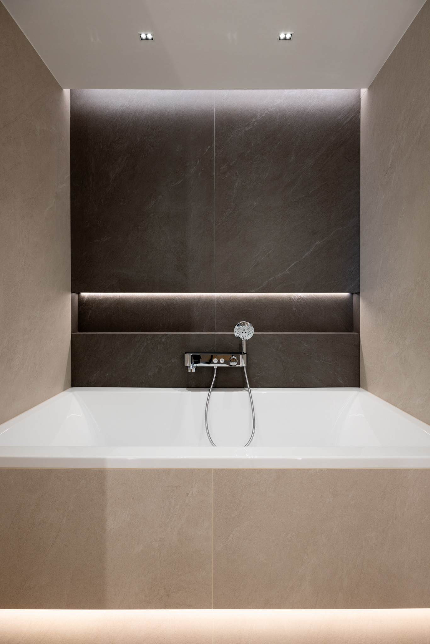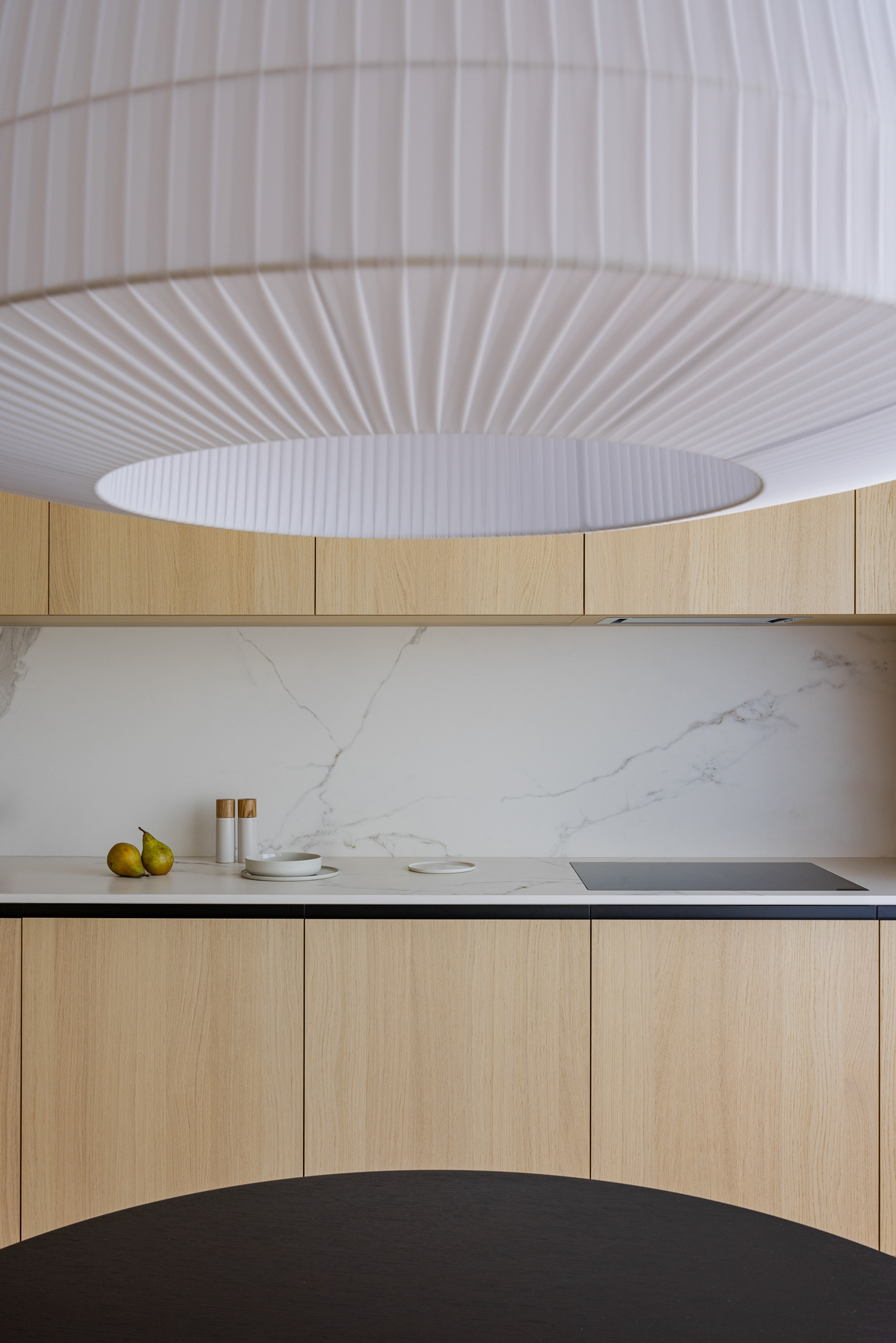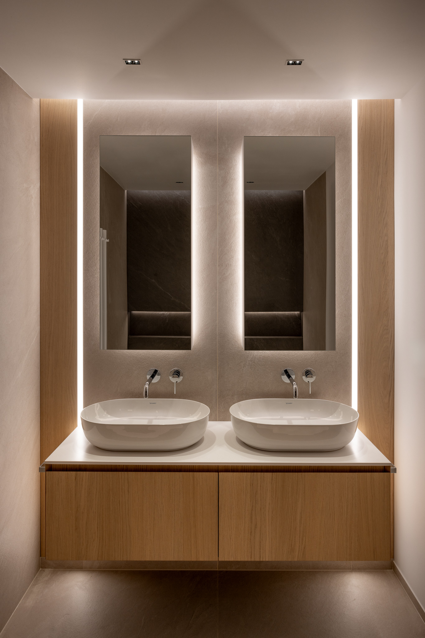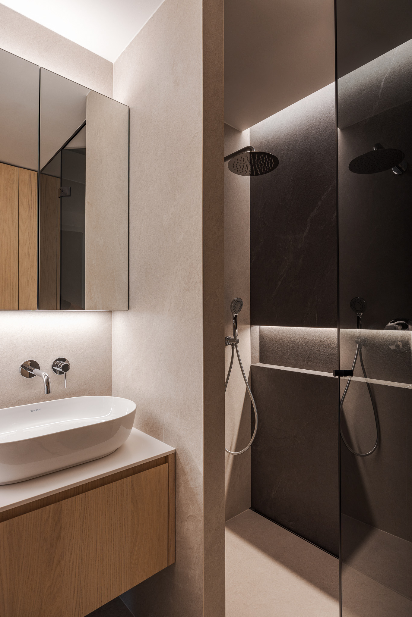 Byt ako celok je navrhnutý v čistých líniach a plochách a v jednotnej materialite s dostatkom úložných priestorov. Vďaka tomu pôsobí uceleným dojmom a majitelia majú dostatočný priestor na odkladanie bez nutnosti zapĺňat priestory ďalšími vecami. Charakteristickým materiálom, ktorý udáva tón je dubové drevo, použité na parketách a vstavaných nábytkoch. Dopĺňané je povrchmi v bielej a sivej farbe. Kontrastom k tejto farebnosti je čierna vo forme svietidiel, typového nábytku a vypínačov. Funkčné povrchy v kúpelniach a kuchyni sú z veľkoformátovej keramiky. Dôraz bol kladený aj na hru s osvetlením. Hlavnú funkciu plní stropné osvetlenie, ktoré je doplňané rôznymi formami led podsvietenia. Vďaka tomu sa dajú v byte vytvoriť viaceré svetelné atmosféry. Pozitívny pocit z interiéru je umocnený aj kvalitným remeselným spracovaním zariadenia a nábytku na mieru."