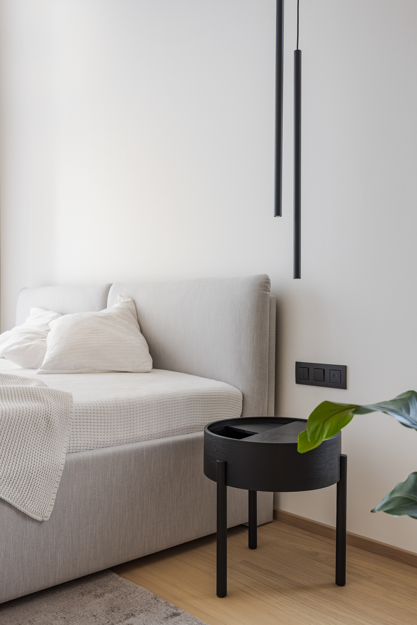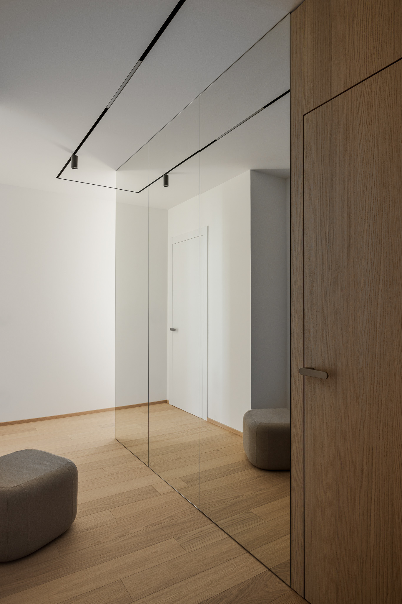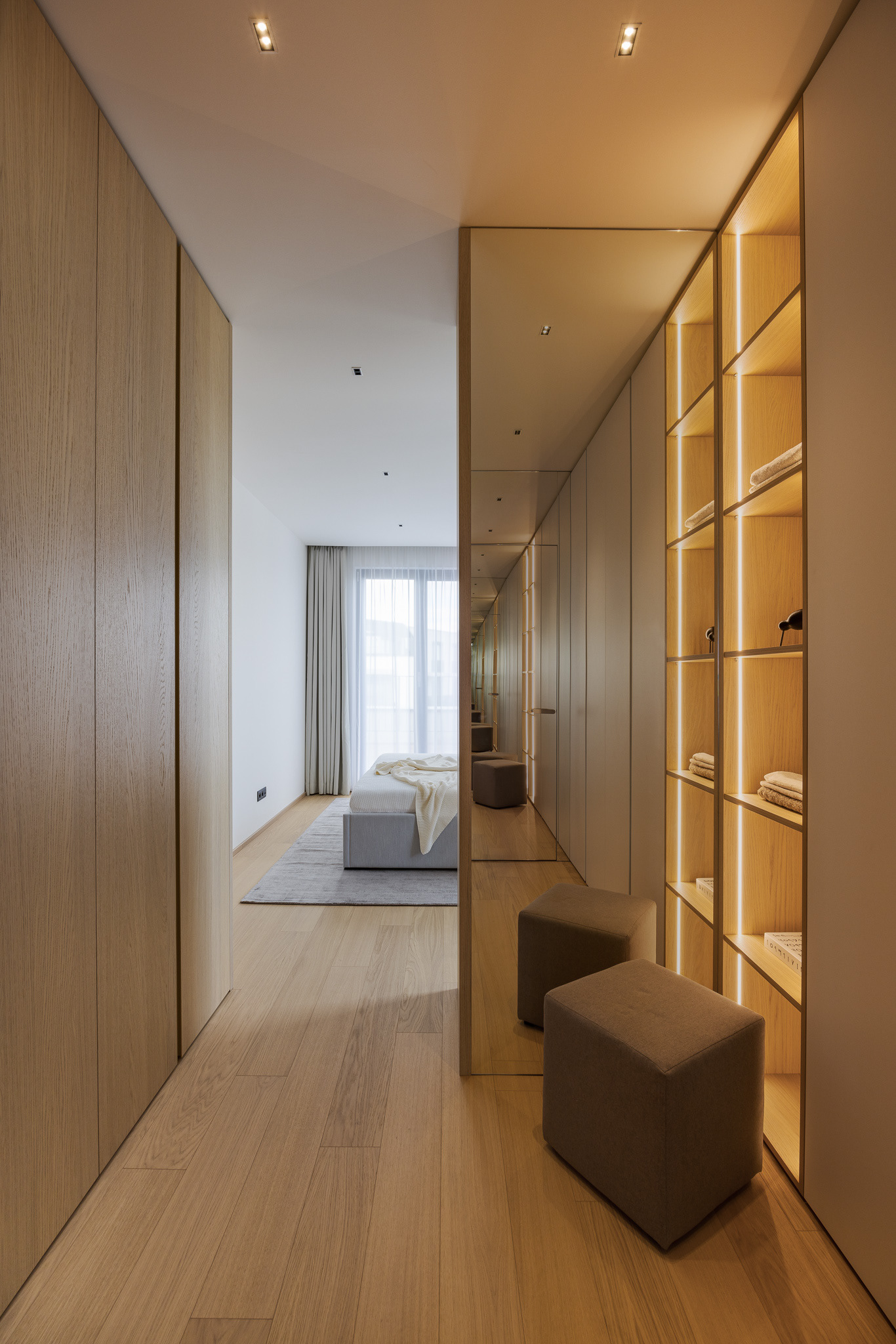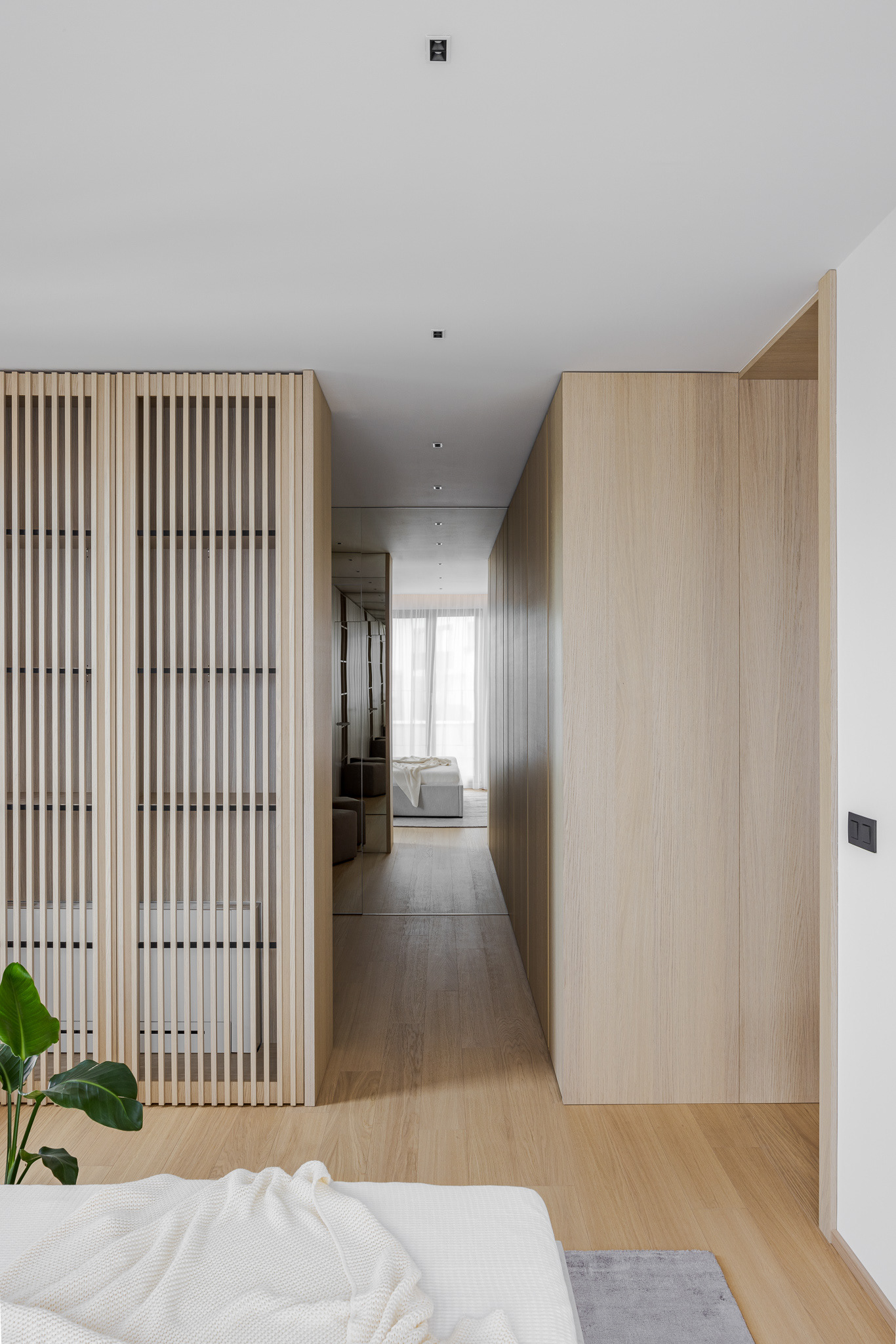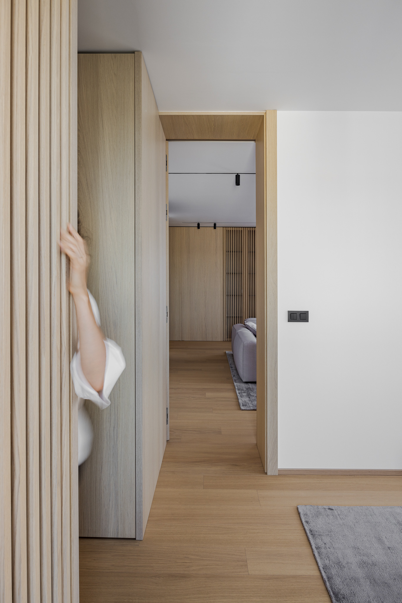 "Realizácia interiéru v novostavbe v Záhorskej Bystrici. Počas práce na návrhu sme navrhli zopár menších stavebných úprav, ktoré zlepšili prevádzku a presvetlenie bytu. Takouto úpravou vzniklo interiérové okno, a to vybúraním časti priečky vo vstupnej chodbe. Dosiahlo sa tým presvetlenie inak tmavého koridoru a pocitovo veľkorysejší vstupný priestor.